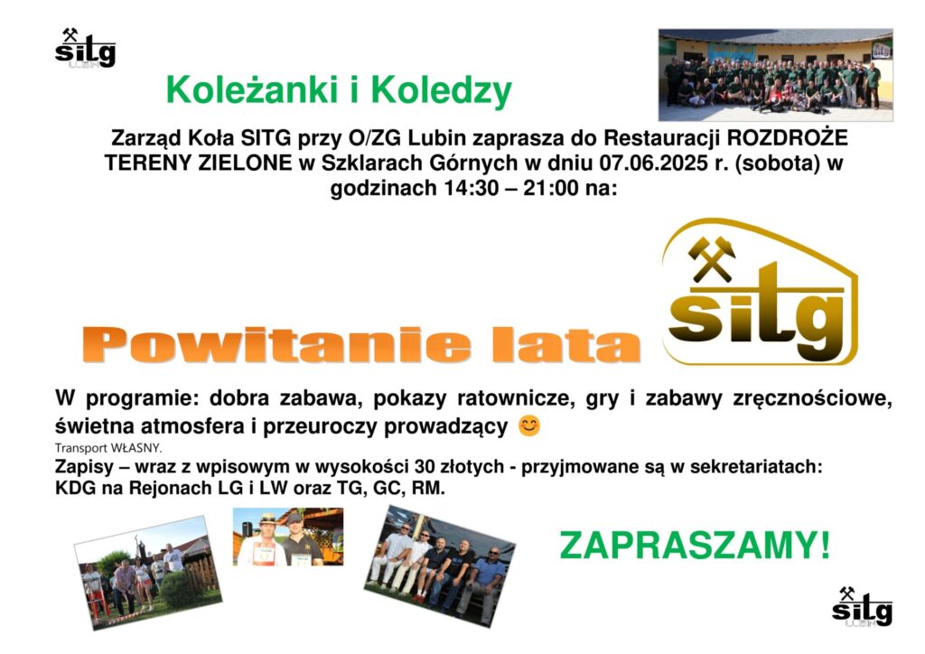 Zarząd Koła ZG „Lubin” Stowarzyszenia Inżynierów i Techników Górnictwa zapraszam na coroczne spotkanie integracyjne naszego środowiska – Powitanie Lata z SITG.