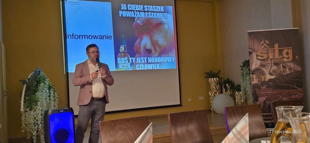 Po części oficjalnej odbyła się prelekcja gościa specjalnego, pana dr Marka Krasińskiego. Tematem wykładu, wieloletniego wykładowcy Uniwersytetu Ekonomicznego we Wrocławiu, twórcy studiów podyplomowych w obszarze ciągłego doskonalenia, była Komunikacja. W tym krótkim wykładzie mogliśmy zobaczyć z jakimi błędami w komunikacie możemy mieć do czynienia i jak forma przekazu może zmienić treść komunikatu. Prelekcja z uwzględnieniem również zabawnych przykładów pozwoliła :miękko” przejść do nieoficjalnej części spotkania, w której dominowały dyskusje, rozmowy i wymiana doświadczeń.